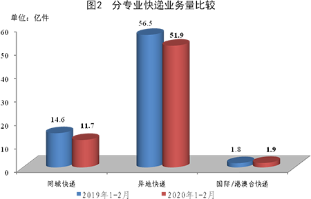 1-2月,全國快遞服務企業業務量累計完成65.5億件,同比下降10.1%;業務收入累計完成864.9億元,同比下降8.7%。其中,同城業務量累計完成11.7億件,同比下降19.6%;異地業務量累計完成51.9億件,同比下降8.1%;國際/港澳臺業務量累計完成1.9億件,同比增長5.3%。