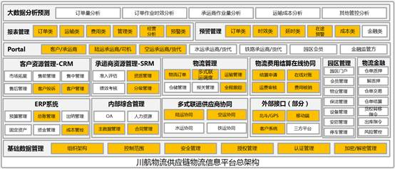 其中黃色部分為本期系統實施范圍,其它部分將會結合川航物流后續發展情況逐步開展。功能中涉及到基礎數據管理、財務結算管理、運輸物流管理、客戶承運商管理、接口管理、企業門戶、報表中心等多個模塊。