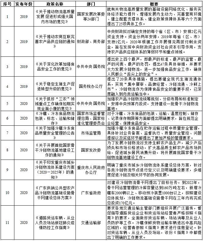 近幾年,國家層面和相關部門密集出臺政策支持冷鏈產業發展。2019年“冷鏈物流”上了中央政治局會議,要求實施城鄉冷鏈物流基礎設施補短板工程。中央一號文件連續15年提及冷鏈物流發展,2020年更是明確開展國家骨干冷鏈基地建設??傊?,從國家重視程度和行業發展趨勢來看,冷鏈物流已成為促進消費升級、推動脫貧攻堅、加快鄉村產業振興、推動產地發展的重要方式。