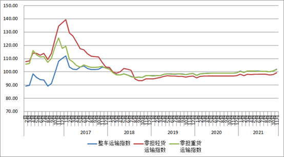 分車型指數看,各車型指數環比小幅回升,同比較快增長。以大宗商品及區域運輸為主的整車指數為102點,比上月回升1.21%,比上年同期增長3.1%。零擔指數中,零擔輕貨指數為99.3點,比上月回升1.2%,比上年同期增長2.4%;零擔重貨指數為101.8點,比上月回升1.19%,比上年同期增長3%。