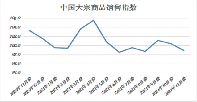 由中國物流與采購聯(lián)合會調(diào)查、發(fā)布的2021年11月份中國大宗商品指數(shù)為99.2%,跌至2020年2月份以來的最低水平。各分項指數(shù)中,供應(yīng)指數(shù)五連跌至二十一個月的最低,銷售指數(shù)兩連跌至9月份以來的最低水平,庫存指數(shù)止跌反彈至近三個月的最高。從本月數(shù)據(jù)的變化情況來看,當(dāng)前國內(nèi)大宗商品市場供需有所失衡,商品庫存開始積壓,市場下行風(fēng)險開始積聚。12月份,隨著氣溫繼續(xù)下降、采暖季工地停工增加,預(yù)計后期國內(nèi)大宗商品市場需求將會進一步萎縮,商品價格也將進一步趨弱向下。