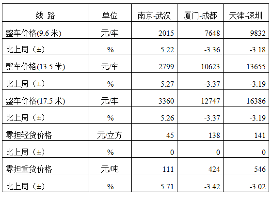 分車型看,各車型指數環比均有所回升。其中,整車指數為1007.73點,比上周回升4.32%;零擔輕貨指數為980.42點,比上周回升4.62%;零擔重貨指數為1007.14點,比上周回升4.40%。