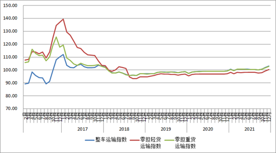 分車型指數看,各車型指數環比小幅回升,且繼續優于去年同期。以大宗商品及區域運輸為主的整車指數為103點,比上月回升0.98%,比上年同期增長3.6%。零擔指數中,零擔輕貨指數為100.3點,比上月回升1.01%,比上年同期增長3.2%;零擔重貨指數為102.8點,比上月回升0.98%,比上年同期增長3.7%。