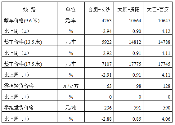 分車(chē)型看,各車(chē)型指數(shù)環(huán)比小幅回升。其中,整車(chē)指數(shù)為1018.23點(diǎn),比上周回升0.95%;零擔(dān)輕貨指數(shù)為990.17點(diǎn),比上周回升1.03%;零擔(dān)重貨指數(shù)為1017.46點(diǎn),比上周回升1.1%。