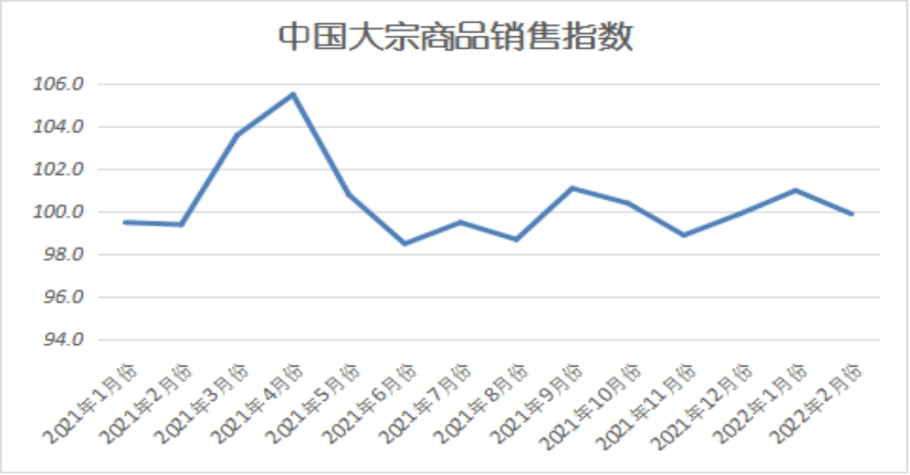 2022年2月份,大宗商品銷售量指數(shù)再度回落,為99.9%,顯示受寒冷天氣以及春節(jié)長假因素的影響,本月大宗商品市場終端需求基本處于停滯狀態(tài),加之節(jié)前備貨較為充足,市場訂貨積極性明顯降低,商品供應企業(yè)訂單組織壓力明顯加大。各主要商品中,鋼鐵、鐵礦石和成品油銷售量均有所減少,煤炭、有色金屬和汽車銷售量雖繼續(xù)增長,但增速有所減緩,化工產品受油價上漲以及季節(jié)性備貨提振,銷售量止跌回升,也是本月大宗商品銷售量指數(shù)下降幅度有限的重要拉動因素。