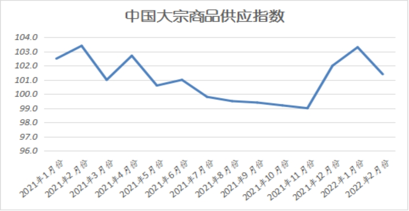 2022年2月份,大宗商品供應指數(shù)為101.4%,指數(shù)在連續(xù)兩個月上升后,本月有所回落,顯示大國內大宗商品市場供應增速有所放緩。從市場情況來看,受春節(jié)假期以及冬奧會限產因素影響,供給端維持低位,不過,部分商品生產利潤較好,企業(yè)生產熱情持續(xù)高漲,且對節(jié)后開工、復工預期樂觀,商品產量仍保持高增長,導致整體供應量仍在持續(xù)增加,僅增速放緩。各主要商品中,除鋼鐵供應受產量減少影響有所下降外,其余品種供應量均呈現(xiàn)增長態(tài)勢。