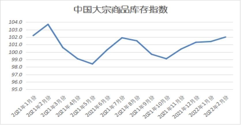 2022年2月份,大宗商品庫存指數(shù)四連升至近一年以來的最高,為102.0%,庫存量增速較上月加快0.6個百分點,顯示當前國內大宗商品市場在供需雙弱的背景下,供需失衡進一步加劇,整體庫存仍在積壓,商品去庫存的難度較高。各主要商品中,煤炭庫存止跌回升,鋼鐵和鐵礦石庫存增速加快,其余品種庫存量繼續(xù)增加,但增速略有減緩。