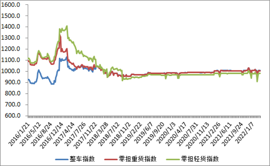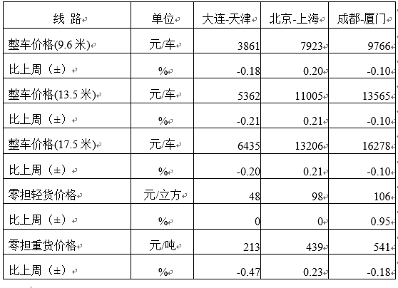 分車型看,各車型指數(shù)環(huán)比漲跌互現(xiàn)。其中,整車指數(shù)為1008.17點(diǎn),比上周回升0.01%;零擔(dān)輕貨指數(shù)為983.68點(diǎn),與上周基本持平;零擔(dān)重貨指數(shù)為1006.01點(diǎn),比上周回落0.1%。