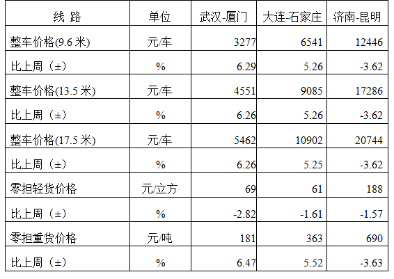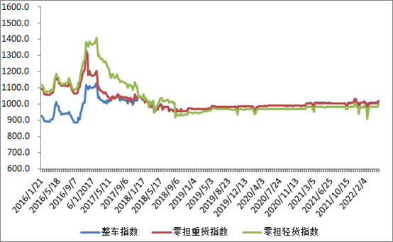 分車(chē)型看,各車(chē)型指數(shù)有不同程度回升。其中,整車(chē)指數(shù)為1017.51點(diǎn),比上周回升0.03%;零擔(dān)輕貨指數(shù)為1003.13點(diǎn),比上周回升1.68%;零擔(dān)重貨指數(shù)為1016.98點(diǎn),比上周回升0.10%。