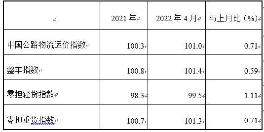 表1 2022年4月中國公路物流運價指數表
