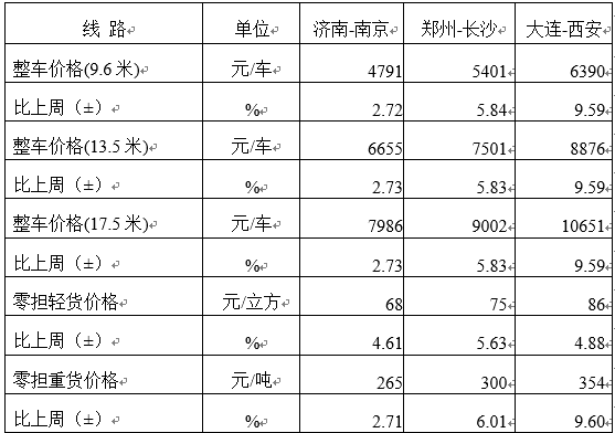 分車型看,各車型指數(shù)環(huán)比漲跌互現(xiàn)。其中,整車指數(shù)為987.41點(diǎn),比上周回落3.98%;零擔(dān)輕貨指數(shù)為1111.76點(diǎn),比上周回升8.95%;零擔(dān)重貨指數(shù)為1122.65點(diǎn),比上周回升9.21%。