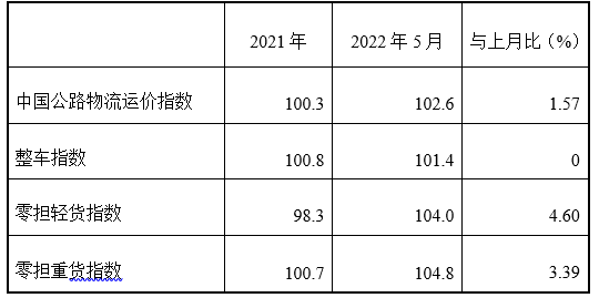 2022年5月份,由中國物流與采購聯合會和林安物流集團聯合調查的中國公路物流運價指數為102.6點,比上月回升1.57%,比去年同期增長2.43%。從周指數看,第一、二、四周運價指數有所回升,第三周運價指數有所回落。