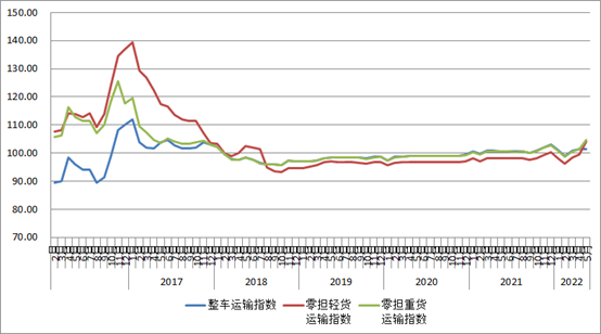 分車型指數看,整車指數總體平穩,零擔指數環比有所回升,與去年同期相比小幅增長。以大宗商品及區域運輸為主的整車指數為101.4點,與上月基本持平,比上年同期增長0.72%。零擔指數中,零擔輕貨指數為104點,比上月回升4.6%,比上年同期增長6%;零擔重貨指數為104.8點,比上月回升3.39%,比上年同期增長4.17%。