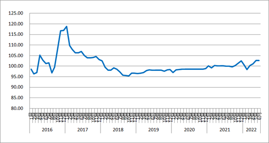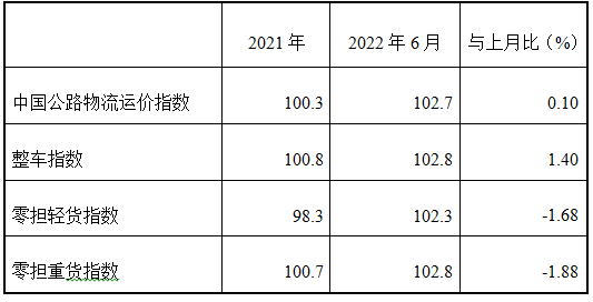 2022年6月份,由中國物流與采購聯合會和林安物流集團聯合調查的中國公路物流運價指數為102.7點,比上月回升0.1%,比去年同期增長2.6%。從周指數看,第二周運價指數環比回升,第一、三、四周運價指數環比回落。