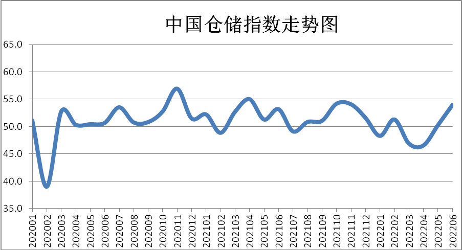 中國物流與采購聯合會和中儲發展股份有限公司聯合調查的中國倉儲指數,2022年6月份為53.9%,較上月上升3.7個百分點,繼續保持在榮枯線以上。隨著各地疫情防控形勢穩中向好以及穩住經濟大盤措施逐步落地,我國經濟三重壓力趨向緩解,市場供需兩端均有明顯恢復,倉儲業務活動較前期更加活躍,行業呈現向好發展態勢。從分項指數看,本月各分項指數均位于榮枯線以上。平均庫存周轉次數、新訂單、企業員工等指數升幅顯著。具體來看,有以下幾個特點: