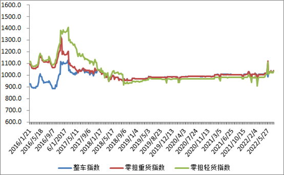 分車型看,各車型指數環比均小幅回升。其中,整車指數為1026.59點,比上周回落1.20%;零擔輕貨指數為1019.68點,比上周回落1.28%;零擔重貨指數為1026.29點,比上周回落1.20%。