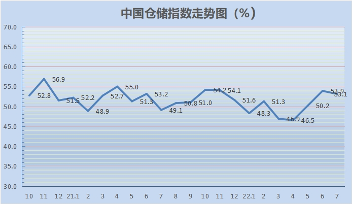 中國物流與采購聯(lián)合會與中儲發(fā)展股份有限公司聯(lián)合調(diào)查的中國倉儲指數(shù),2021年7月份為53.1%,雖然較上月回落0.8個百分點,但仍保持在較高水平。各分項指數(shù)中,收費價格指數(shù)、業(yè)務(wù)利潤指數(shù)、主營業(yè)務(wù)成本指數(shù)、期末庫存指數(shù)及業(yè)務(wù)活動預(yù)期指數(shù)較上月有所回升,其余指數(shù)均有不同程度的回落。