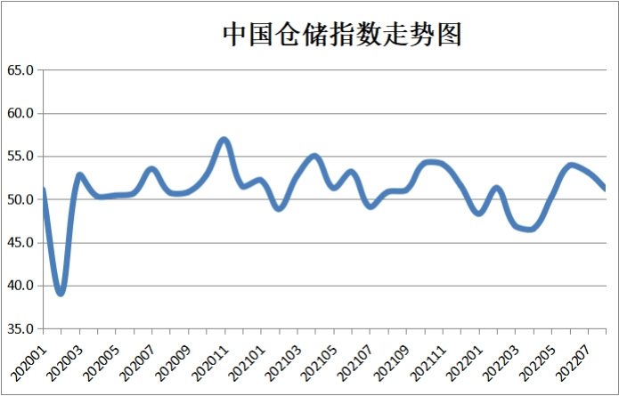 中國物流與采購聯合會和中儲發展股份有限公司聯合調查的中國倉儲指數,2022年8月份為51.2%,較上月下降1.9個百分點,連續2個月環比下降,且降幅較上月有所擴大,但仍位于榮枯線以上,且高于去年同期和上半年平均水平,新訂單、業務量、設施利用率等分項指數均有小幅上漲。綜合來看,倉儲業務需求增勢較好,行業整體繼續保持擴張態勢,但擴張力度有所減弱。具體來看,有以下幾個特點: