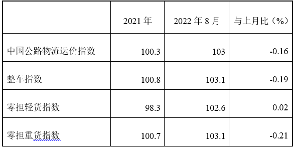 2022年8月份,由中國物流與采購聯(lián)合會和林安物流集團聯(lián)合調(diào)查的中國公路物流運價指數(shù)為103點,比上月回落0.16%,比去年同期增長3%。從周指數(shù)看,第一、三周運價指數(shù)環(huán)比回升,第二、四周運價指數(shù)環(huán)比回升。