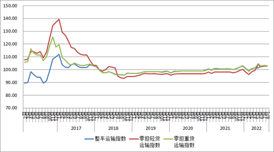 分車型指數(shù)看,各車型指數(shù)環(huán)比漲跌互現(xiàn),同比去年小幅增長。以大宗商品及區(qū)域運輸為主的整車指數(shù)為103.1點,比上月回落0.19%,比上年同期增長2.6%。零擔指數(shù)中,零擔輕貨指數(shù)為102.6點,比上月回升0.02%,比上年同期增長4.6%;零擔重貨指數(shù)為103.1點,比上月回落0.21%,比上年同期增長2.6%。
