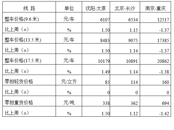 分車型看,各車型指數環比漲跌互相。其中,整車指數為1027.99點,比上周回升0.04%;零擔輕貨指數為1048.21點,比上周回落0.02%;零擔重貨指數為1026.65點,比上周回升0.04%。