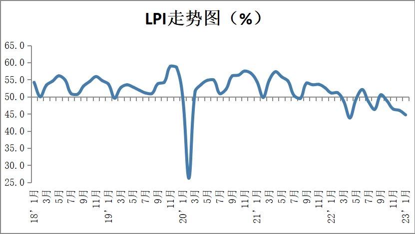 中國物流與采購聯合會發布的2023年1月份中國物流業景氣指數為44.7%,較上月回落1.3個百分點;中國倉儲業指數為43.2%,較上月回落5.5個百分點。