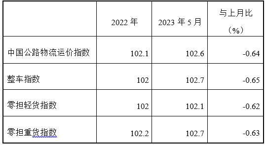 2023年5月份,由中國物流與采購聯合會和林安物流集團聯合調查的中國公路物流運價指數為102.6點,比上月回落0.64%,與去年同期基本持平。從周指數看,第一、三周運價指數環比回落,第二、四周運價指數環比回升。
