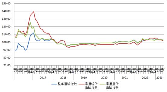 分車型指數看,各車型指數環比小幅回落,同比去年漲跌互現。以大宗商品及區域運輸為主的整車指數為102.7點,比上月回落0.65%,比上年同期增長1.25%。零擔指數中,零擔輕貨指數為102.1點,比上月回落0.62%,比上年同期下降1.9%;零擔重貨指數為102.7點,比上月回落0.63%,比上年同期下降2%。