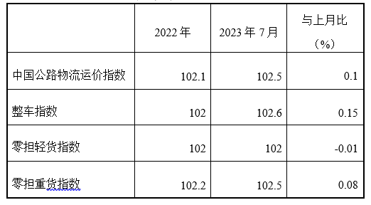 表1 2023年7月中國公路物流運價指數(shù)表