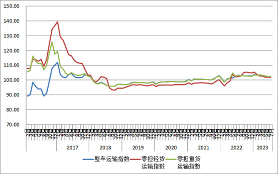 分車型指數(shù)看,各車型指數(shù)環(huán)比漲跌互現(xiàn),同比去年小幅下降。以大宗商品及區(qū)域運輸為主的整車指數(shù)為102.6點,比上月回升0.15%,比上年同期下降0.68%。零擔指數(shù)中,零擔輕貨指數(shù)為102點,比上月回落0.01%,比上年同期下降0.6%;零擔重貨指數(shù)為102.5點,比上月回升0.08%,比上年同期下降0.77%。