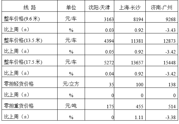 分車(chē)型看,各車(chē)型指數(shù)環(huán)比有所回升。其中,整車(chē)指數(shù)為1027.15點(diǎn),比上周回升0.01%;零擔(dān)輕貨指數(shù)為1020.39點(diǎn),比上周回升0.01%;零擔(dān)重貨指數(shù)為1026.13點(diǎn),比上周回升0.01%。