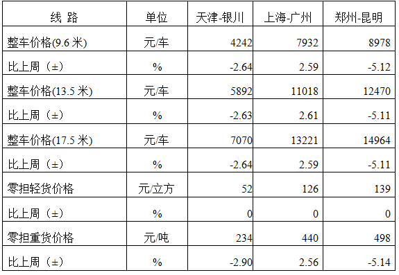 表1 本周部分線路平均價格及環比情況對比