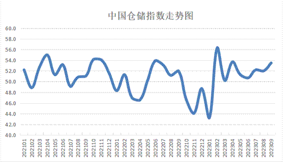 中國物流與采購聯(lián)合會和中儲發(fā)展股份有限公司聯(lián)合調(diào)查的中國倉儲指數(shù),2023年9月份為53.5%,較上月上升1.5個(gè)百分點(diǎn),連續(xù)八個(gè)月保持在擴(kuò)張區(qū)間,本月升幅較為明顯,并達(dá)到近五個(gè)月內(nèi)的高點(diǎn),顯示倉儲行業(yè)保持較快發(fā)展水平。新訂單、業(yè)務(wù)量、設(shè)施利用率、業(yè)務(wù)利潤、期末庫存、業(yè)務(wù)活動預(yù)期等指數(shù)均有回升,表明倉儲業(yè)務(wù)需求增勢較好,企業(yè)盈利狀況有所改善,補(bǔ)庫積極性提高,對未來預(yù)期較為樂觀。具體來看,本月指數(shù)有以下幾個(gè)特點(diǎn):
