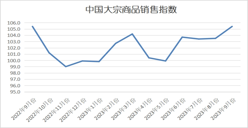 2023年9月份,大宗商品銷售指數(shù)較上月上升1.9個百分點(diǎn),至105.4%,指數(shù)兩連升至2022年10月份以來的最高點(diǎn),顯示在宏觀政策利多的護(hù)航下,以及傳統(tǒng)需求旺季的來臨,終端用戶備貨更顯積極,市場銷售情況向好,企業(yè)訂單組織更為順暢,本月國內(nèi)大宗商品銷售增速較上月有所加快。各主要商品中,本月各商品銷售量呈現(xiàn)全面增加的局面,化工銷售量止跌回升。