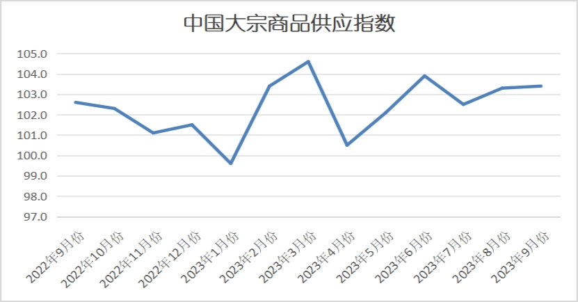 2023年9月份,大宗商品供應(yīng)指數(shù)兩連升至102.6%,較上月上升0.1個百分點(diǎn),顯示隨著國內(nèi)經(jīng)濟(jì)和制造業(yè)的復(fù)蘇,市場需求持續(xù)回暖,商品生產(chǎn)企業(yè)對后市預(yù)期良好,生產(chǎn)熱情高漲,國內(nèi)大宗商品市場供應(yīng)量不斷增加,增速繼續(xù)加快。從各主要商品來看,本月汽車供應(yīng)量止跌回升,煤炭、有色金屬和化工供應(yīng)量繼續(xù)增加,且增速加快,鋼鐵、鐵礦石和成品油供應(yīng)量雖繼續(xù)增加,但增速有所放緩。