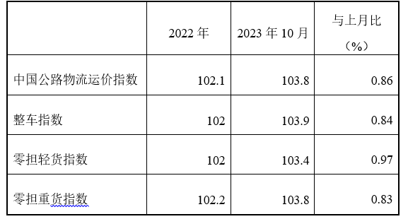 2023年10月份,由中國物流與采購聯合會和林安物流集團聯合調查的中國公路物流運價指數為103.8點,比上月回升0.86%,比去年同期增長0.49%。從周指數看,第一、四周運價指數環比回落,第二、三周運價指數環比回升。