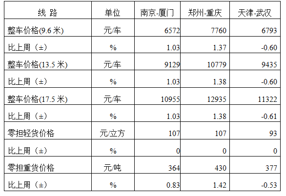 分車型看,各車型指數環比略有回落。其中,整車指數為1038.35點,比上周回落0.03%;零擔輕貨指數為1033.48點,比上周回落0.01%;零擔重貨指數為1037.31點,比上周回落0.04%。