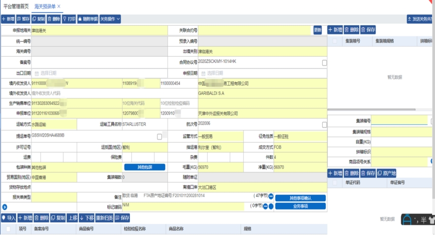 支持海關(guān)預(yù)錄信息導(dǎo)入,開(kāi)放客戶(hù)權(quán)限,前置錄入報(bào)關(guān)相關(guān)信息的同時(shí),還可以利用OCR識(shí)別技術(shù)上傳電子版報(bào)關(guān)信息,系統(tǒng)自動(dòng)識(shí)別和抓取業(yè)務(wù)數(shù)據(jù),一鍵生成海關(guān)預(yù)錄單,通過(guò)關(guān)務(wù)共享中心,對(duì)接單一窗口,實(shí)現(xiàn)客戶(hù)端與海關(guān)無(wú)縫連接,從而提高各個(gè)環(huán)節(jié)的操作效率。