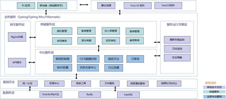 大宗散雜貨出口管理系統(tǒng)采用外運(yùn)股份FROS微服務(wù)框架前后端分離技術(shù),支持多種前端框架,后端服務(wù)主要包括網(wǎng)關(guān)服務(wù)層、前端服務(wù)層、中臺(tái)服務(wù)層、服務(wù)運(yùn)行支撐層,并通過(guò)第三方服務(wù)提供基礎(chǔ)服務(wù)支持。其中后端服務(wù)采用MVC架構(gòu)模式,作為常用的敏捷開(kāi)發(fā)框架之一,簡(jiǎn)化了應(yīng)用程序開(kāi)發(fā)的分層復(fù)雜度,具備高可用性、高可維護(hù)性、高伸縮性等特點(diǎn)。