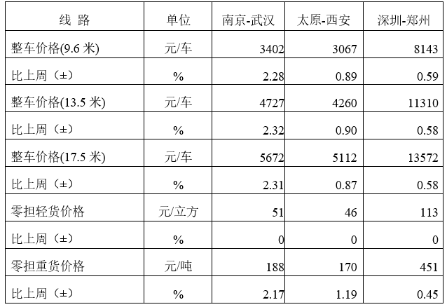 分車型看,各車型指數環比漲跌互現。其中,整車指數為1042.01點,比上周回升0.09%;零擔輕貨指數為1033.47點,比上周回升0.01%;零擔重貨指數為1040.96點,與上周基本持平。
