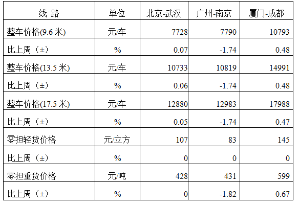 分車型看,各車型指數環比漲跌互現。其中,整車指數為1040.36點,比上周回落0.09%;零擔輕貨指數為1033.73點,比上周回升0.02%;零擔重貨指數為1039.36點,比上周回落0.09%。