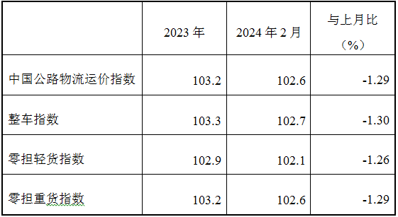 2024年2月份,由中國物流與采購聯合會和林安物流集團聯合調查的中國公路物流運價指數為102.6點,比上月回落1.29%,比去年同期回落0.82%。從周指數看,第一、三周運價指數環比回升,第二、四周運價指數環比回落。