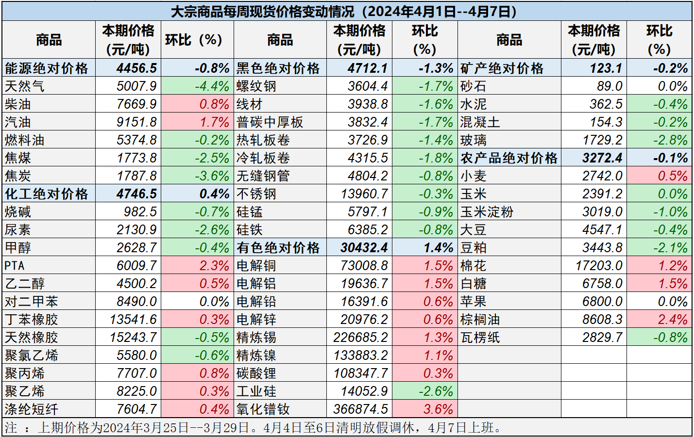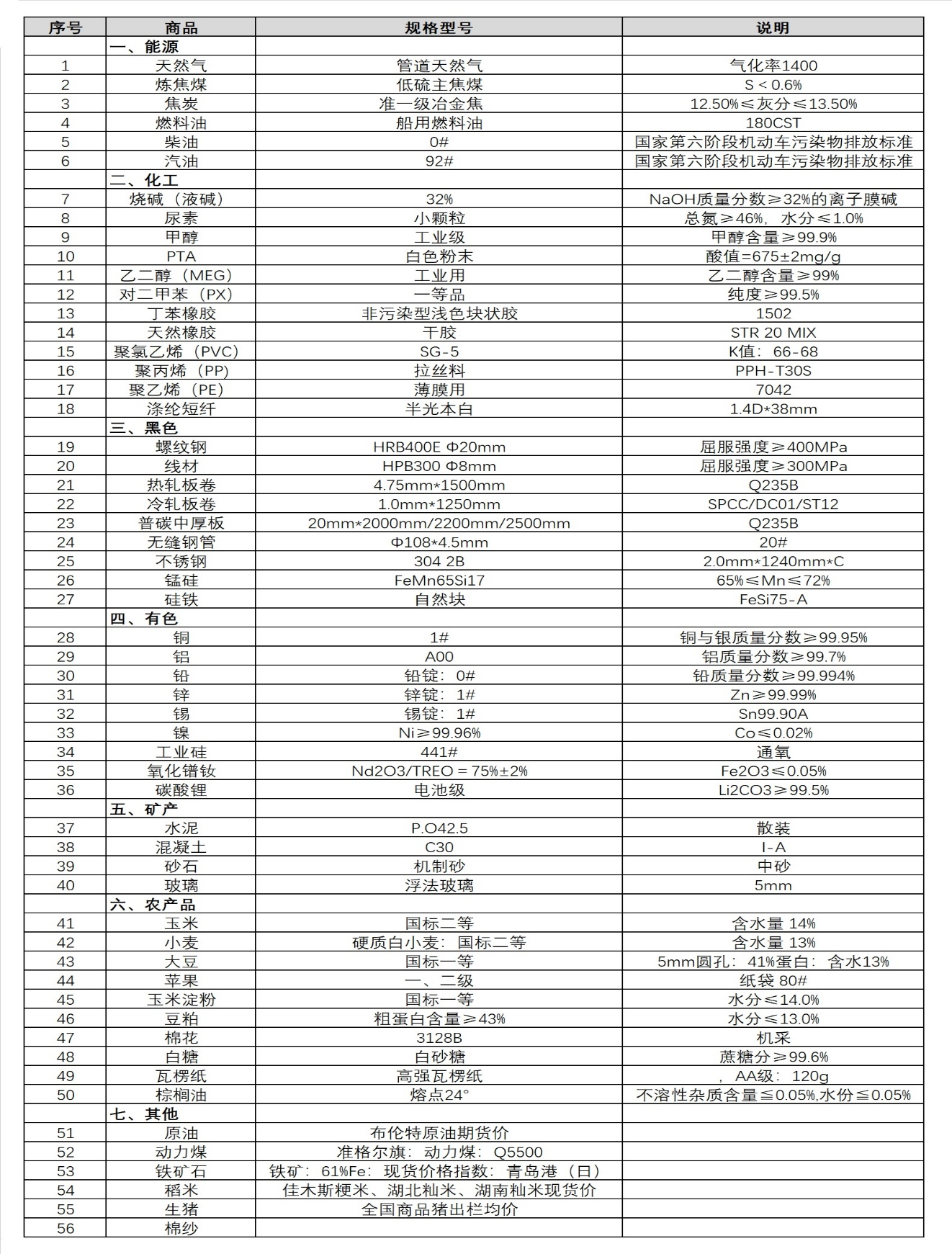 本表所示大宗商品價(jià)格(類別與產(chǎn)品規(guī)格說明見附表)為以人民幣計(jì)價(jià)的現(xiàn)貨價(jià)格(包含流通費(fèi)用、利潤(rùn)和稅費(fèi)等)。計(jì)算這些價(jià)格時(shí)使用的信息來源,主要包括國(guó)內(nèi)重點(diǎn)地區(qū)的生產(chǎn)商、貿(mào)易商及下游消費(fèi)企業(yè)之間的成交、詢報(bào)盤及可成交價(jià)格。價(jià)格單位為人民幣元/噸。