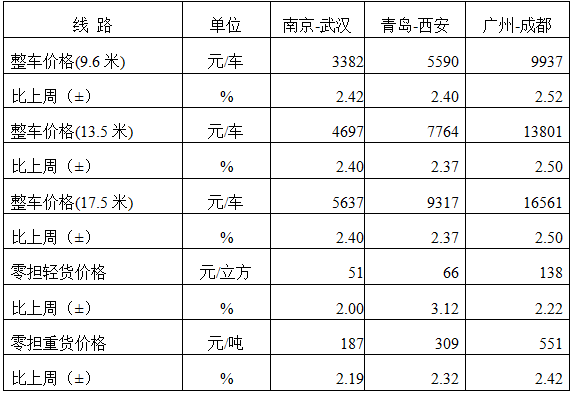 表1 本周部分線路平均價格及環(huán)比情況對比