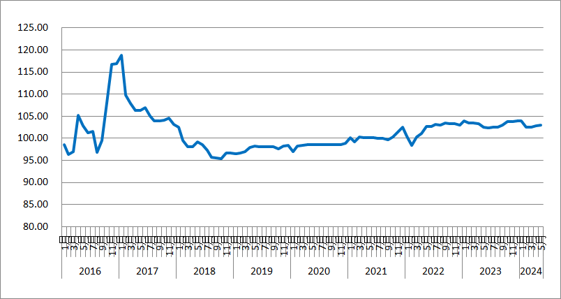2024年5月份,由中國物流與采購聯合會和林安物流集團聯合調查的中國公路物流運價指數為103點,比上月回升0.13%,比去年同期回升0.39%。從周指數看,第一、五周運價指數環比回落,第二、三、四周運價指數環比回升。