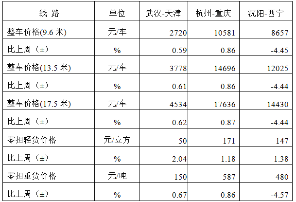 分車型看,各車型指數環比小幅回升。其中,整車指數為1044.47點,比上周回升1.46%;零擔輕貨指數為1028.07點,比上周回升1.32%;零擔重貨指數為1044.04點,比上周回升1.45%。