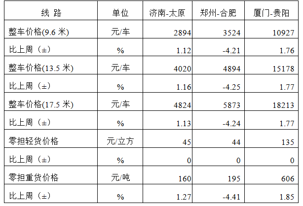 表1 本周部分線路平均價格及環(huán)比情況對比