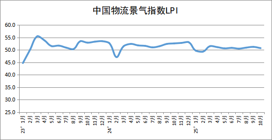 中國物流與采購聯(lián)合會發(fā)布的2025年10月份中國物流業(yè)景氣指數(shù)為50.7%,較上月回落0.5個百分點。