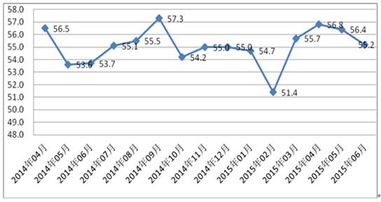 圖1 2014年4月-2015年6月福建省物流業景氣指數(LPI)走勢