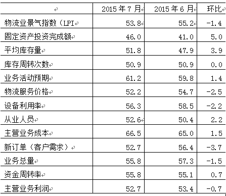 4.物流服務價格、利潤指數有所回落,成本有所回升。7月份,物流服務價格指數較上月回落2.5個百分點,為52.2%;主營業務利潤指數小幅回落0.7個百分點,為52.7%;主營業務成本指數回升1.5個百分點,為66.5%。物流服務價格回落的主要原因:一方面是每年的5~8月是公路物流需求的相對平穩期,運價存在季節性回落;另一方面,則是隨著經濟增長方式轉變和產業升級換代,大宗商品需求與貨運量增勢出現回落,導致價格有所回落。物流服務價格的回落,造成企業業務成本的上升和利潤的下降,因此成本指數有所回升,利潤指數有所回落,顯示出物流企業經營壓力繼續增大。